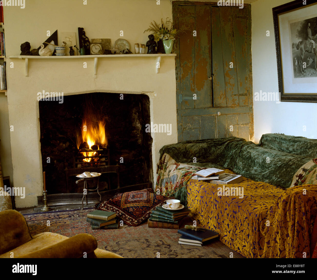 Sessel blau und Creme und Sahne Sofa gesetzt um den Kamin ...